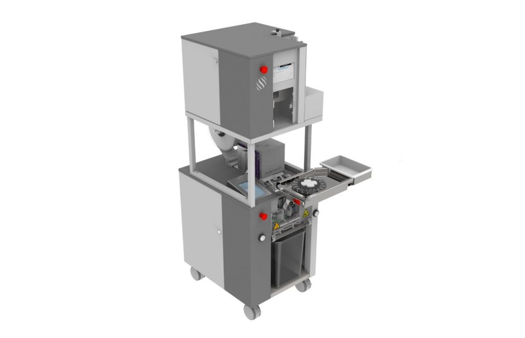 • También unitariza medicamentos mediante un sistema de discos intercambiables rotativos con funcionamiento automático y sensores de detección de paso para activación, avance y parada del ítem para llenar el insumo de unitarización. La alimentación de los discos giratorios sucede de forma asistida por el operador del equipo;