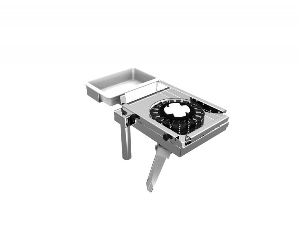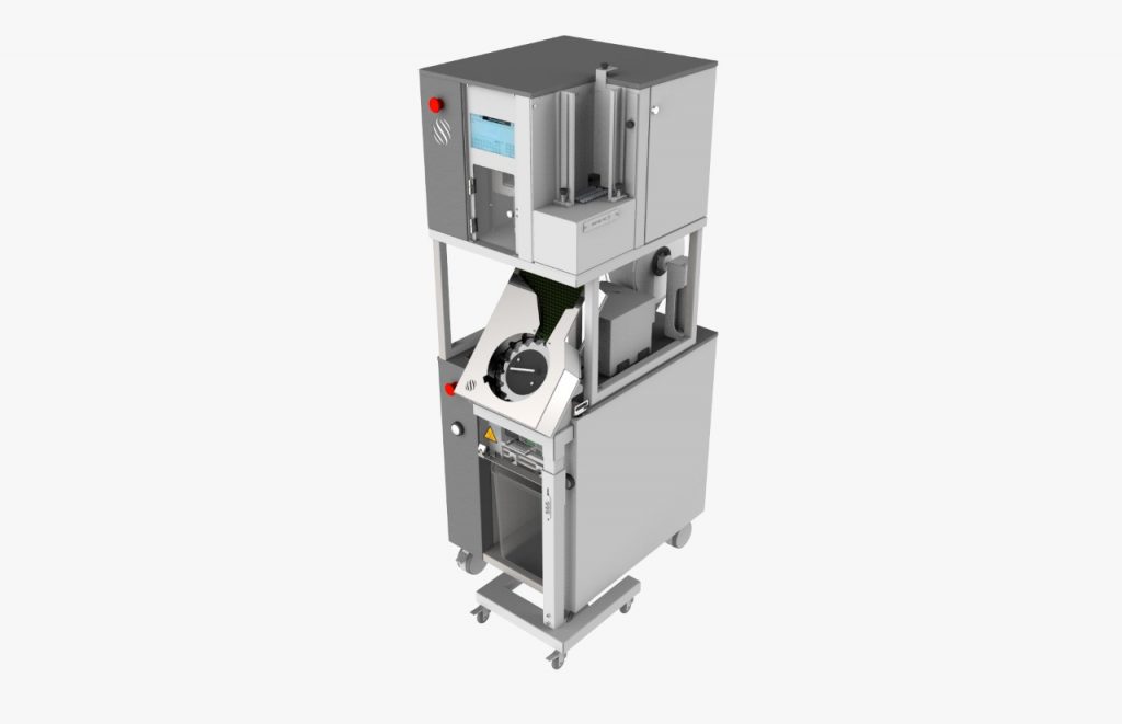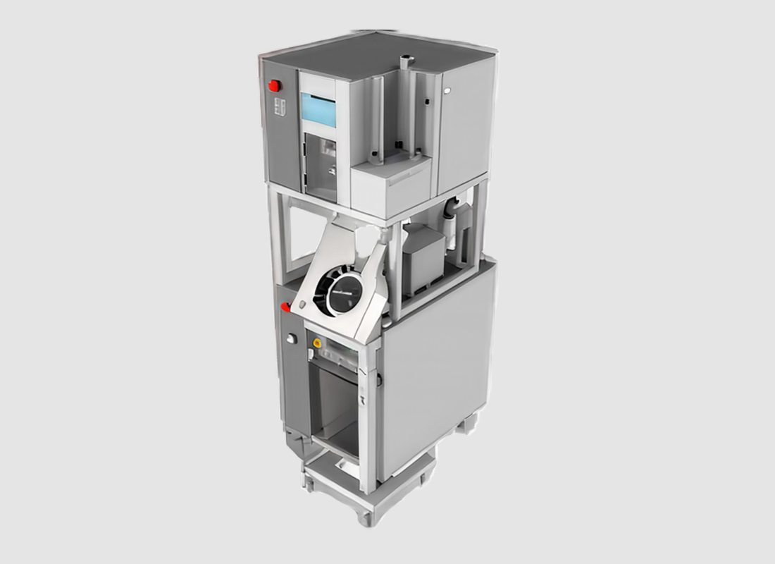 • Sistema de sellado microprocesado; • Bandeja giratoria horizontal semiautomática en acero inoxidable con dispositivo de acoplamiento rápido para el armado y la retirada de discos de alimentación;